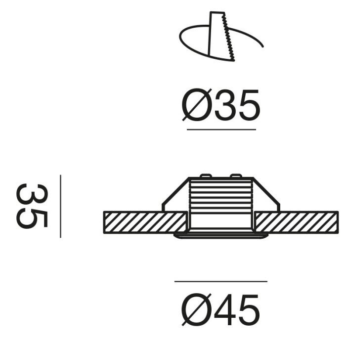 Compacte inbouwspot met aluminium frame en satijnzwarte afwerking.