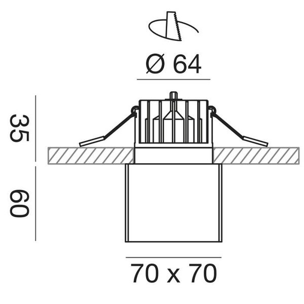 Vierkante inbouwspot met aluminium frame en transparante diffuser, geschikt voor vochtige ruimtes (IP54).