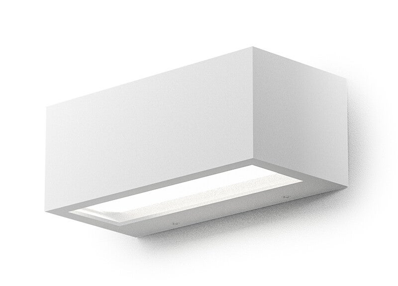 Moderne buitenwandlamp met gegoten aluminium frame en stijlvolle witte afwerking.